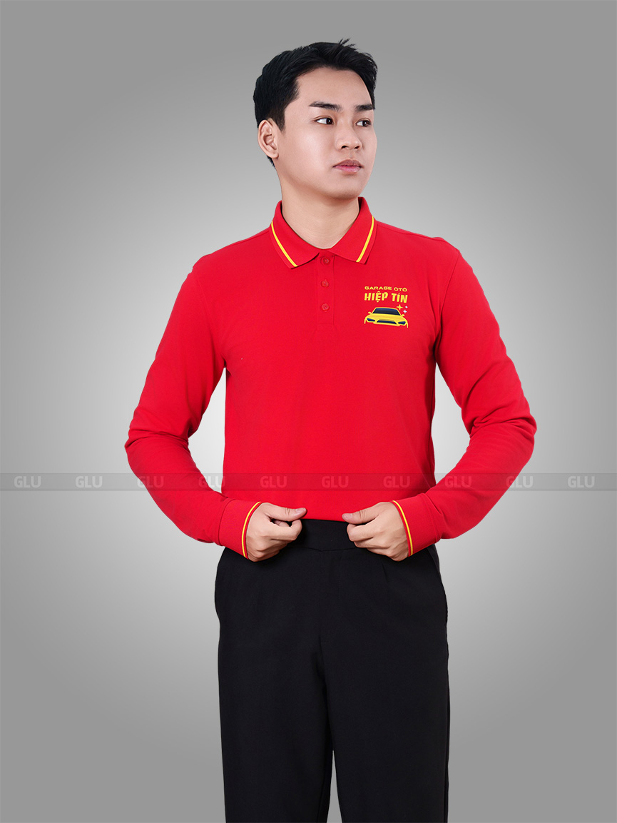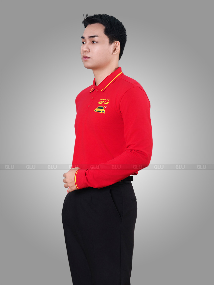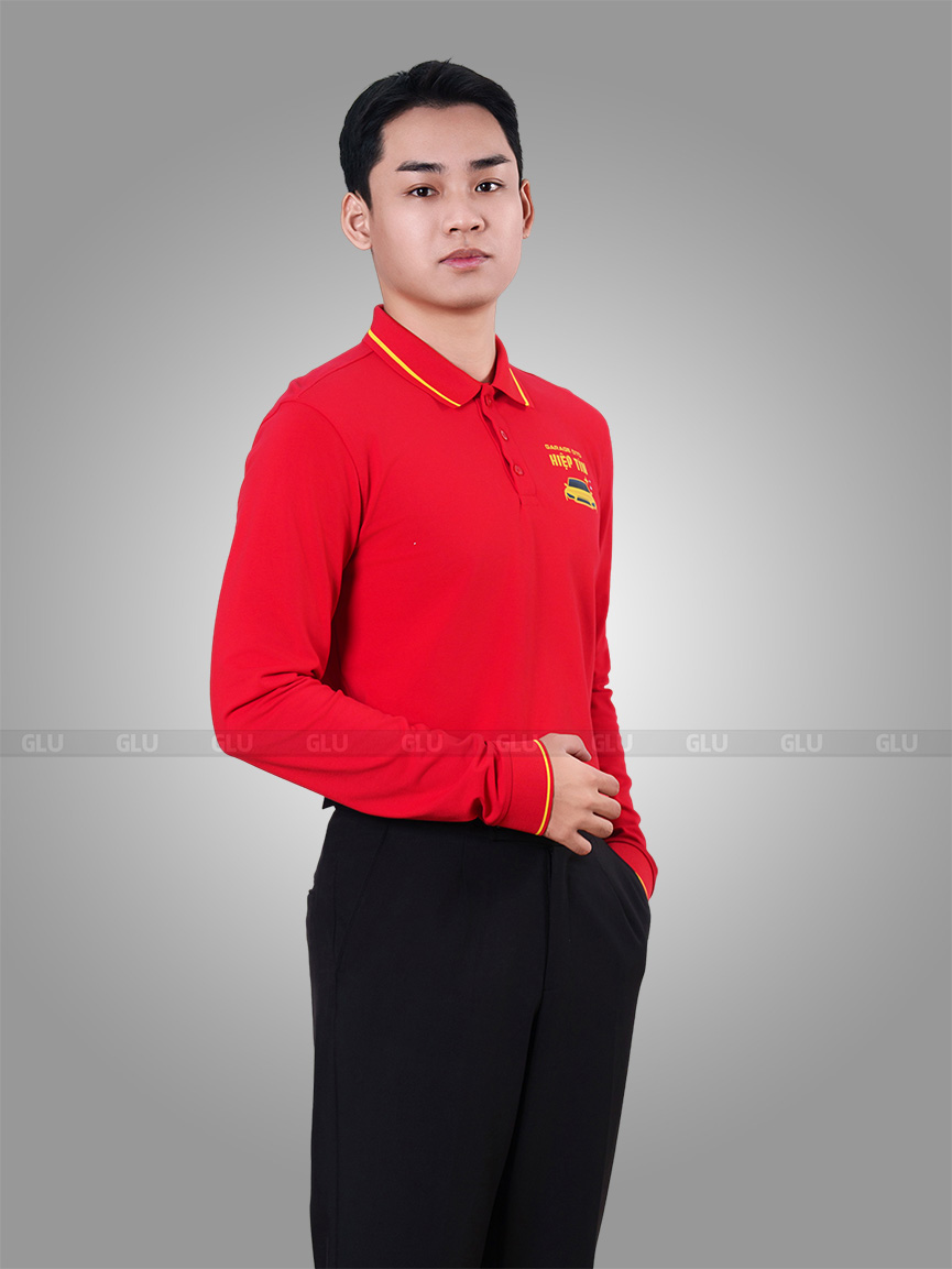 Được may từ chất liệu vải cá sấu co giãn tốt và thấm hút hiệu quả, mẫu áo đồng phục tay dài với gam màu đỏ tạo ấn tượng với phong cách trẻ trung và hiện đại. Cổ áo dệt phối đường line vàng tạo sự tương phản nhưng không kém phần tinh tế, sắc nét, tạo nên điểm nhấn hài hòa. Form dáng suông nhẹ, dễ mặc, tôn lên sự chuyên nghiệp trong môi trường làm việc cần sự chỉn chu và thoải mái.